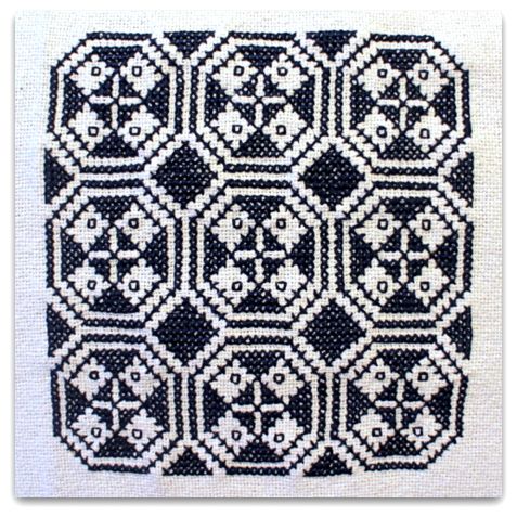 charakteryzują się geometrycznymi motywami, wyszytymi ciemnoniebieskimi